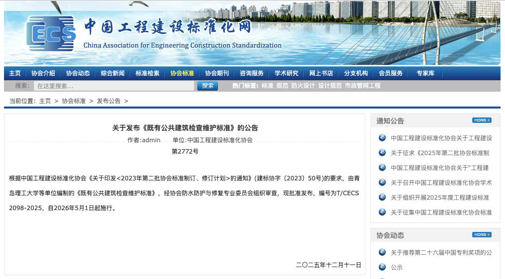 2025年12月11日,中國工程建設(shè)標(biāo)準(zhǔn)化協(xié)會(CECS)正式批準(zhǔn)發(fā)布了兩項(xiàng)關(guān)鍵行業(yè)標(biāo)準(zhǔn)——《既有公共建筑檢查維護(hù)標(biāo)準(zhǔn)》(T/CECS 2098-2025)與《既有居住建筑檢查維護(hù)標(biāo)準(zhǔn)》(T/CECS 2097-2025)。該兩項(xiàng)標(biāo)準(zhǔn)的制定是基于協(xié)會《2023年第二批協(xié)會標(biāo)準(zhǔn)制訂、修訂計(jì)劃》(建標(biāo)協(xié)字〔2023〕50號)的要求,由青島理工大學(xué)等單位牽頭編制,青島中邦科技新材料有限公司作為參編單位之一,為標(biāo)準(zhǔn)的制定貢獻(xiàn)了專業(yè)力量。